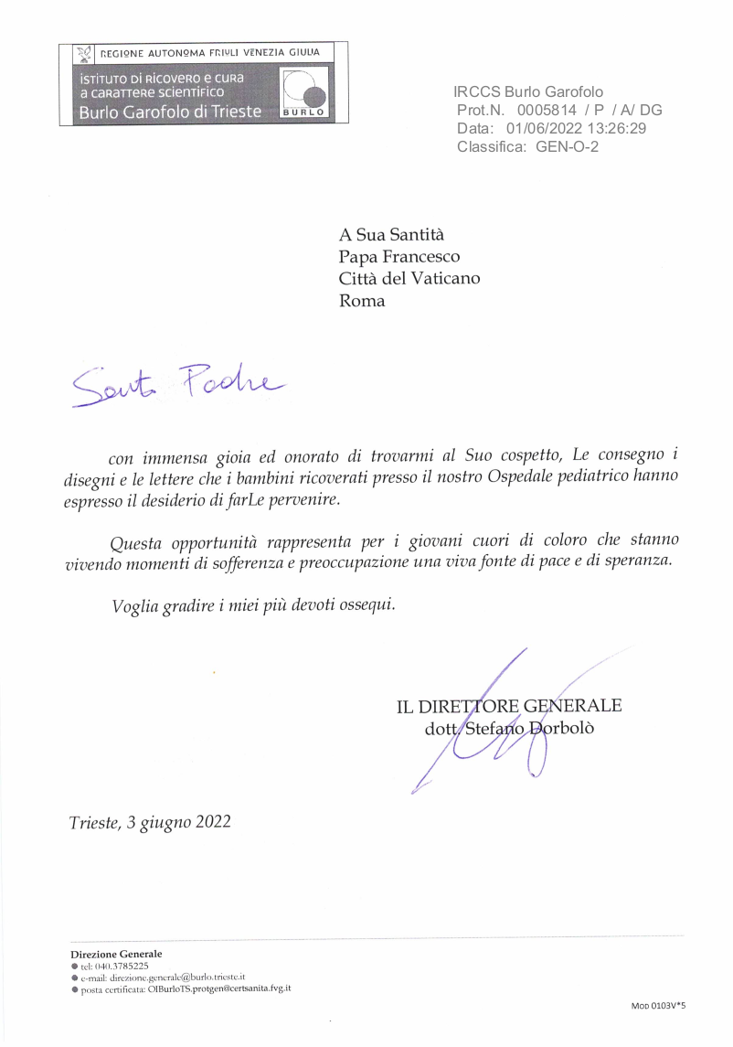 Successivamente il Vaticano ha voluto ribadire i ringraziamenti ai bambini ospiti al Burlo per il loro affetto, mandando una lettera all’IRCCS materno infantile in cui sono espresse la vicinanza e la benedizione di Papa Francesco a tutti loro