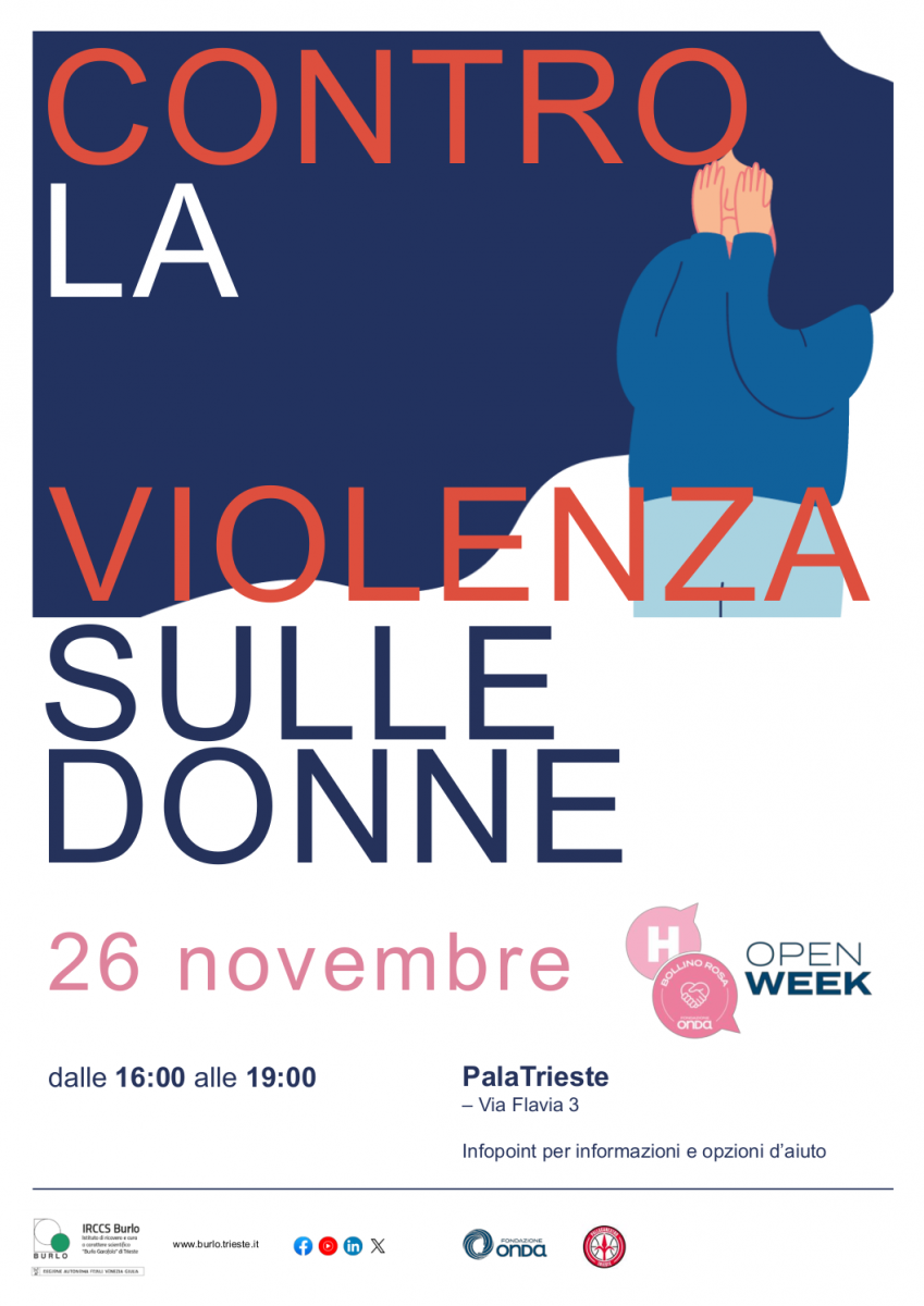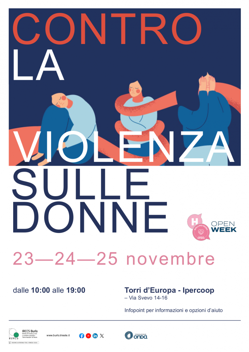 È con questa ferma convinzione che l’Irccs Materno Infantile “Burlo Garofolo”, all’interno dell’open week organizzata dalla Fondazione Onda in occasione della giornata mondiale contro la violenza sulle donne, allestisce due Infopoint, uno presso il Centro Commerciale “Torri d’Europa” di Trieste che rimarrà aperto dal 23 al 25 novembre dalle 10.00 alle 19.00, di fronte alle casse dell’Ipercoop e uno il 26 novembre dalle 16.00 alle 19.00 presso il PalaTrieste in occasione della partita della Pallacanestro Trieste, vicino allo store della società sportiva. I due punti informativi forniranno chiarimenti e indicazioni sulle possibilità di aiuto, assistenza e difesa per le donne vittime di violenze. Violenze cui spesso, purtroppo, assistono impotenti anche i figli fin dalla più tenera infanzia.