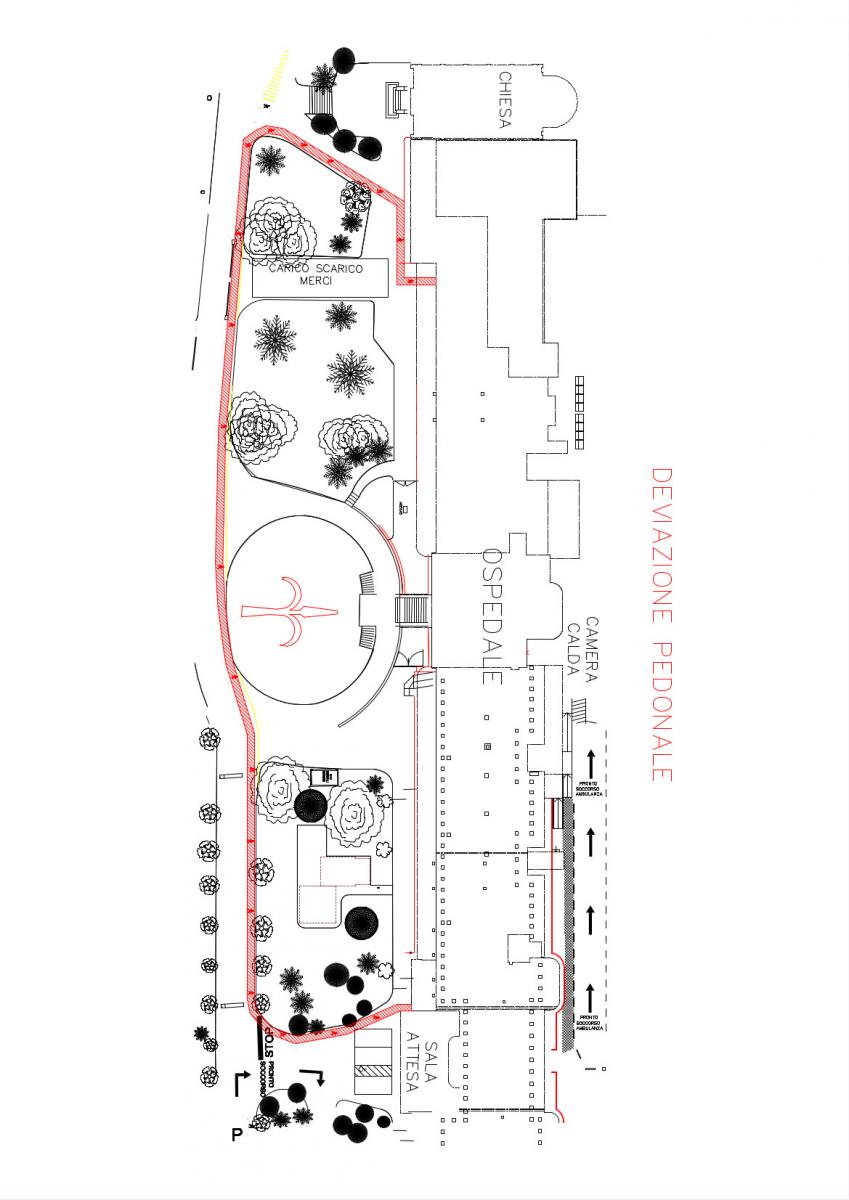Il percorso esterno “Deviazione pedonale” sarà indicato da apposita segnaletica. Ai pazienti con difficoltà di deambulazione sarà indicato un percorso all’interno dell’ospedale.