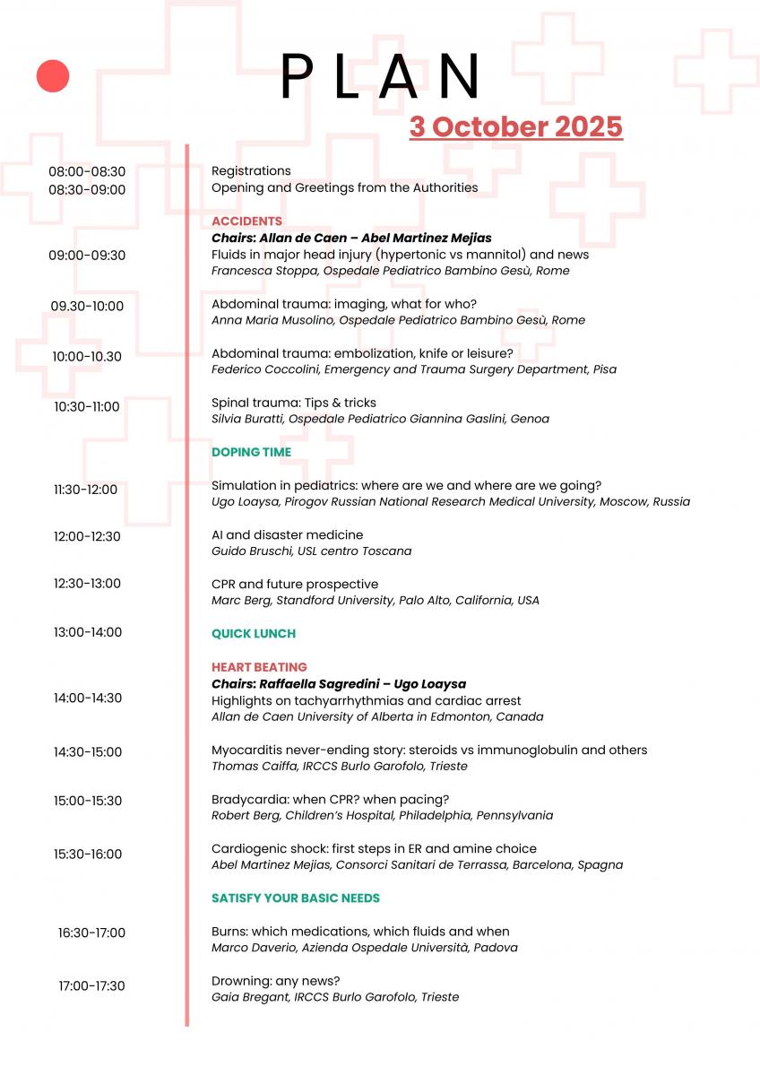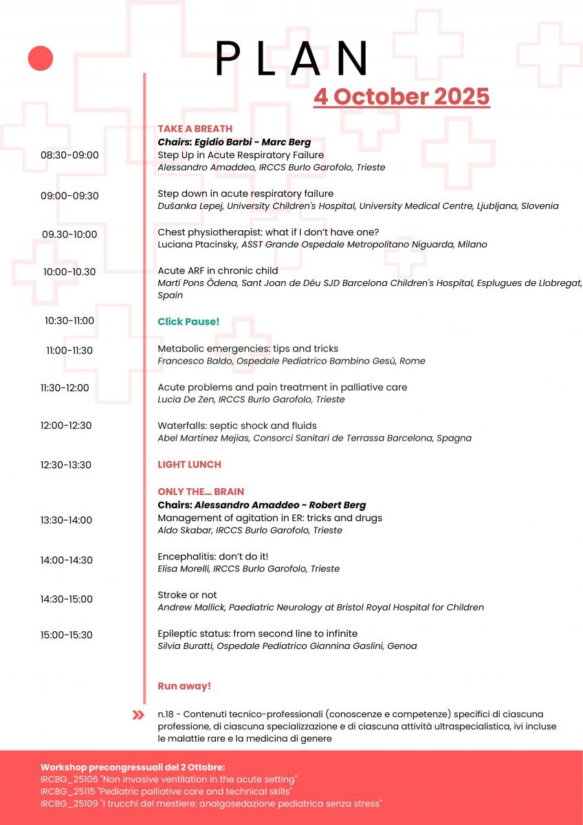 Attraverso un’interazione dinamica, workshop pratici pre-congressuali e sessioni tematiche, i partecipanti avranno l’opportunità di acquisire abilità concrete e strumenti utili a migliorare la qualità delle cure in ambito pediatrico d’emergenza.