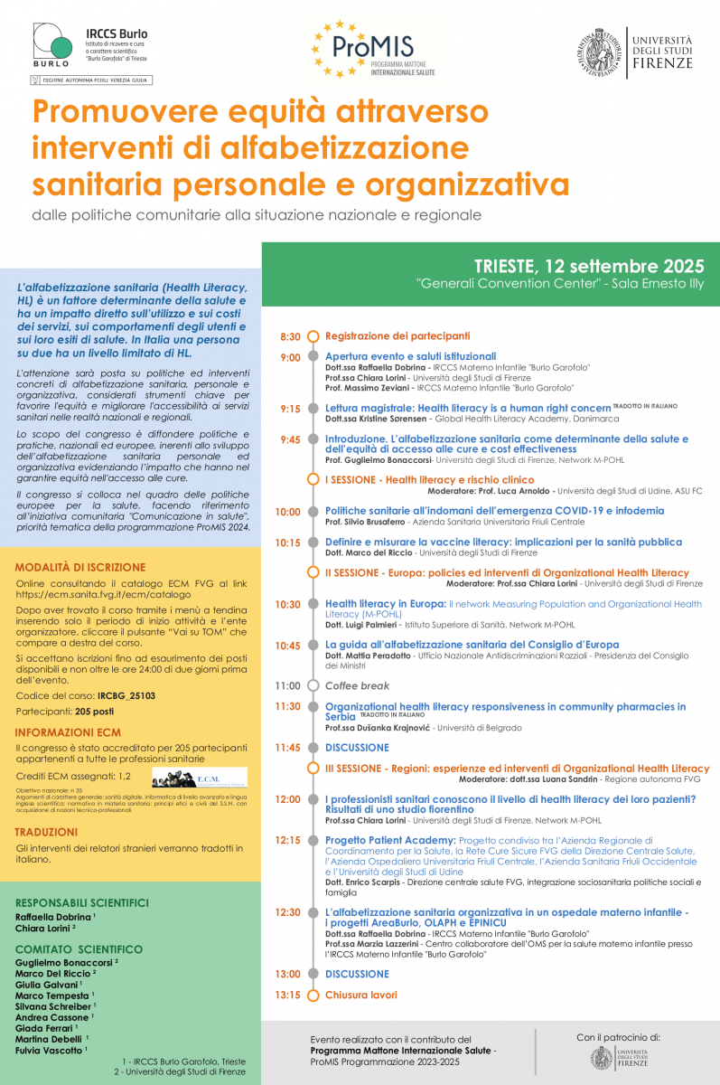 TRIESTE – 12 settembre 2025. Il "Generali Convention Center" - Sala Ernesto Illy di Trieste ospiterà il congresso Promuovere equità attraverso interventi di alfabetizzazione sanitaria personale e organizzativa dalle politiche comunitarie alla situazione nazionale e regionale.