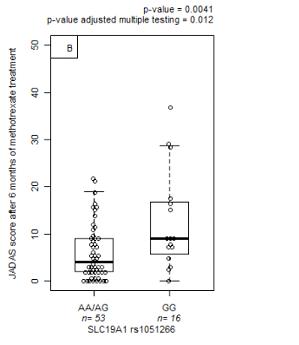 fig.1: Risposta clinica misurata attraverso lo score JADAS per l’artrite idiopatica giovanile. La risposta clinica al methotrexate risulta essere maggiore nei pazienti portatori di alcuni specifici polimorfismi presenti sul gene che sovraintende il metabolismo del methotrexate
