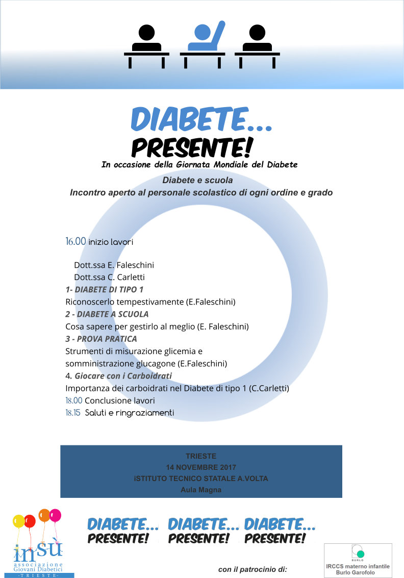 Anche quest'anno l'IRCCS Burlo Garofolo in collaborazione con l'associazione INSU ha organizzato per il 14 novembre un incontro di formazione interattivo sul riconoscimento precoce del diabete e sulla sua corretta gestione anche in ambiente scolastico per consentire la piena integrazione dei bambini con diabete.