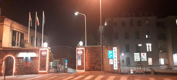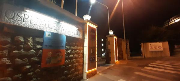 IRCCS Burlo Garofolo: ingresso principale con luci di colore arancione.