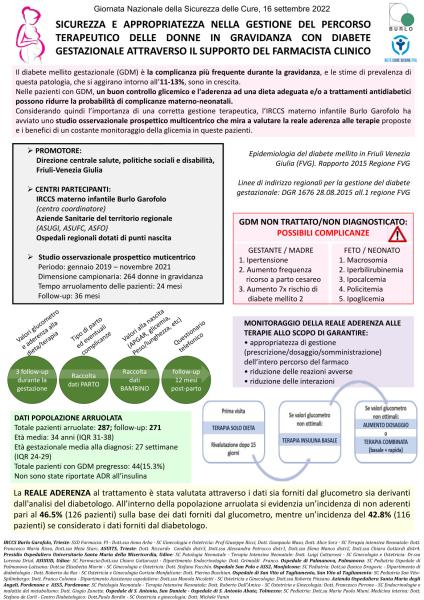 Il primo manifesto è sul Diabete Mellito Gestazionale (GDM), che è la complicanza più frequente durante la gravidanza ed è noto che un buon controllo glicemico e l'aderenza ad una dieta adeguata e/o a trattamenti antidiabetici possono ridurre la probabilità di complicanze materno-neonatali. Considerando quindi l’importanza di una corretta gestione terapeutica, l’IRCCS ha avviato uno studio osservazionale prospettico multicentrico che mira a valutare la reale aderenza alle terapie proposte e i benefici di un costante monitoraggio della glicemia in queste pazienti.