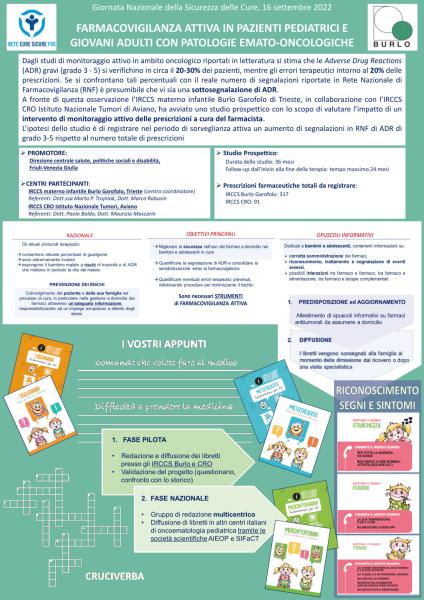 Il secondo studio si è concentrato sull’analisi dei dati storici provenienti dal monitoraggio attivo in ambito oncologico negli IRCCS materno infantile Burlo Garofolo di Trieste e CRO Istituto Nazionale Tumori di Aviano. In particolare, si è riscontrata la tendenza ad una sotto segnalazione di Adverse Drug Reactions (ARDs - reazioni avverse ai farmaci) nella Rete Nazionale di Farmacovigilanza (RNF). Sulla base di questa consapevolezza, quindi, questo studio prospettico mira a registrare, durante il periodo di sorveglianza attiva, un aumento di segnalazioni di ARDs in RNF rispetto al totale delle prescrizioni.