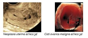 - Ecocolor Doppler bi-tridimensionale: consente di visualizzare e studiare il decorso dei vasi e delle ramificazioni vascolari degli organi genitali interni sia in condizioni fisiologiche che patologiche, fornendo un ulteriore criterio differenziale tra formazioni benigne, borderline e maligne.