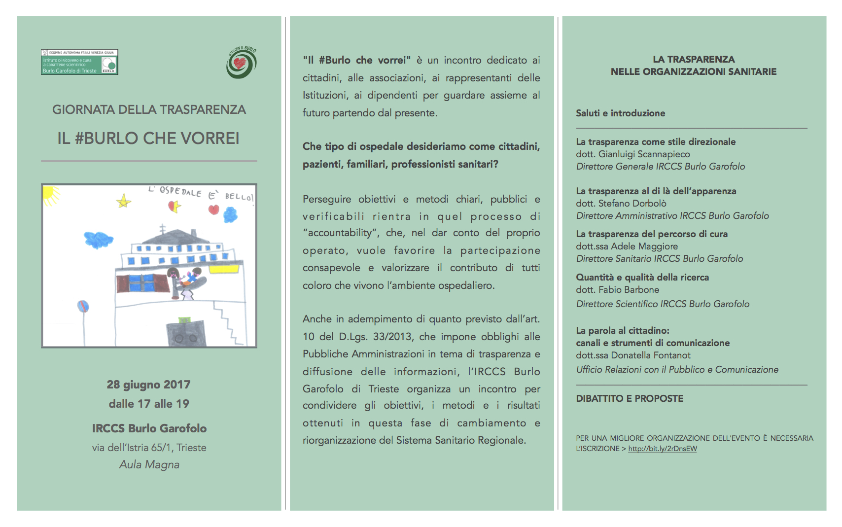 Il 28 giugno, dalle 17 alle 19, nell'Aula Magna (via dell'Istria 65/1 - Trieste), l'IRCCS Burlo Garofolo organizza la Giornata della Trasparenza, dal titolo "Il #Burlo che vorrei", incontro dedicato ai cittadini, alle associazioni, ai rappresentanti delle Istituzioni, ai dipendenti per guardare assieme al futuro partendo dal presente.