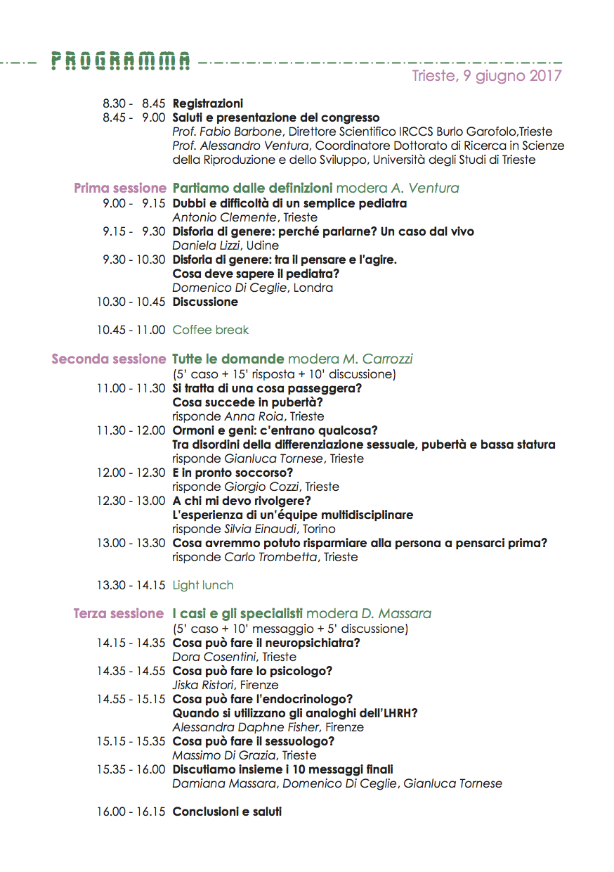 Durante il congresso verrà anche illustrata l’attività, il ruolo e le modalità della presa in carico di bambini con varianza di genere da parte dell’équipe multidisciplinare specializzata APEVAGE - Ambulatorio Pediatrico per la Varianza di Genere - che è stata istituita al Burlo, quale centro di riferimento su questa tematica.